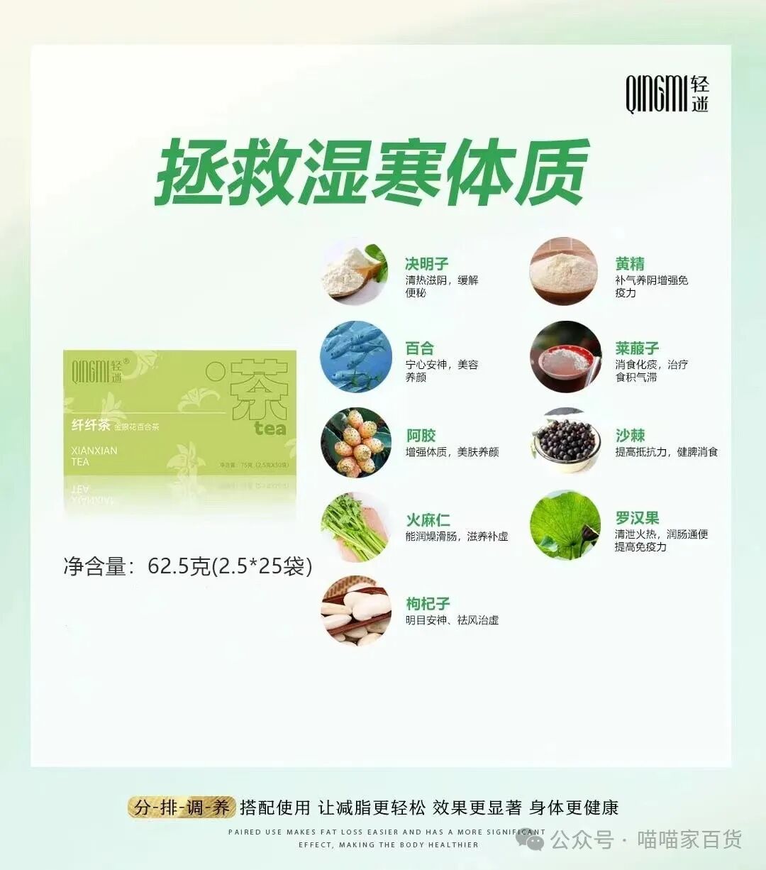轻迷纤纤祛湿茶具有促进代谢、改善消化功能、减少脂肪吸收的功效,可以排油阻脂、增加饱腹感并辅助控制体重。成分如下图